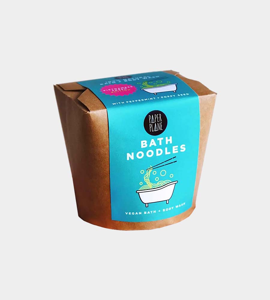 100% natural, vegan bath noodles in plastic-free biodegradable packaging.